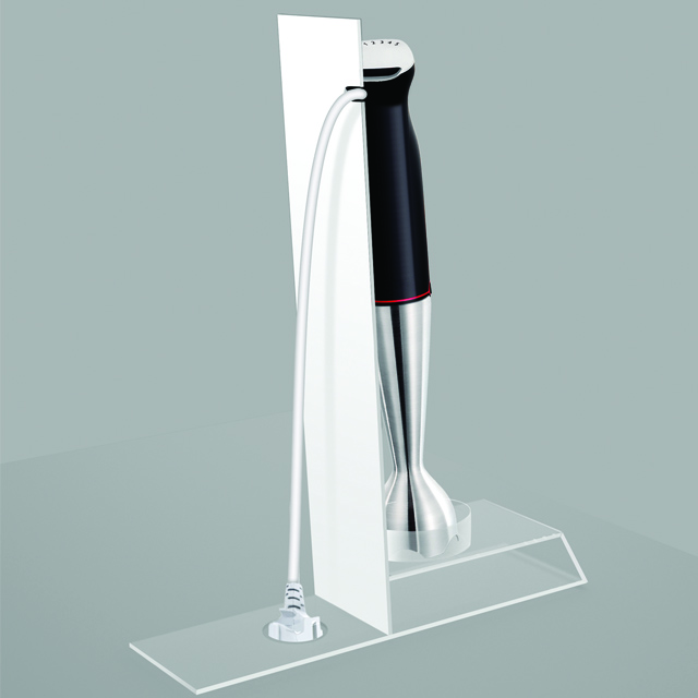 Az átlátszó plexiből, kézzel készült polc displaynek a termékpalettájukon megtalálható számos botmixer elhelyezésére alkalmasnak kellett lennie.
