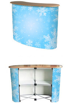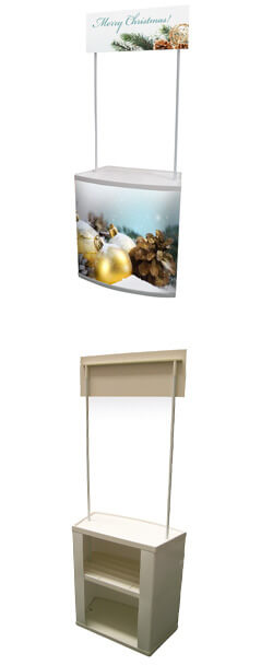 Pop up pult. Nagy teherbírásának és nagy pultfelületének köszönhetően alkalmas szinte bármilyen termék bemutatására. Összeállítása nagyon egyszerű, így rövidebb promóciók alkalmával is alkalmazható.